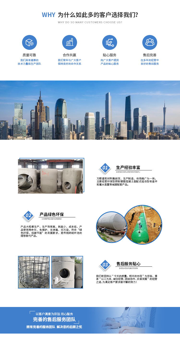 黃山市萬順建筑科技有限公司是集研發(fā),生產(chǎn)制造,市場推廣為一體的綜合性企業(yè)。公司主要經(jīng)營環(huán)保型預(yù)制鋼筋混凝土裝配式組合型檢查井和蓄水裝置等城建配套產(chǎn)品。產(chǎn)品生產(chǎn)過程采用獨特的生產(chǎn)工藝,機械化流水作業(yè)。產(chǎn)品大規(guī)模生產(chǎn),生產(chǎn)效率高,耗能少,成本低,產(chǎn)品使用壽命長、免維護(hù)、無滲漏、無污染,符合“綠色環(huán)保,低碳節(jié)能”的發(fā)展要求,是傳統(tǒng)磚砌井池的理想替代產(chǎn)品。